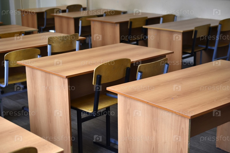 Школьные принадлежности. Концепция образования. Школьные парты и стулья в классе ученика в школе