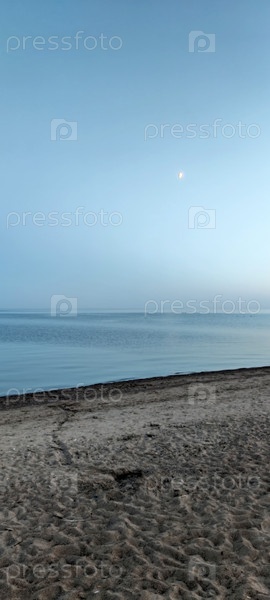 Ночной пейзаж на берегу залива. Белая ночь, легкие сумерки, солнце ушло за горизонт, Песчаный ровный берег залива и спокойная голубая вода и небо. Луну видно вдалеке