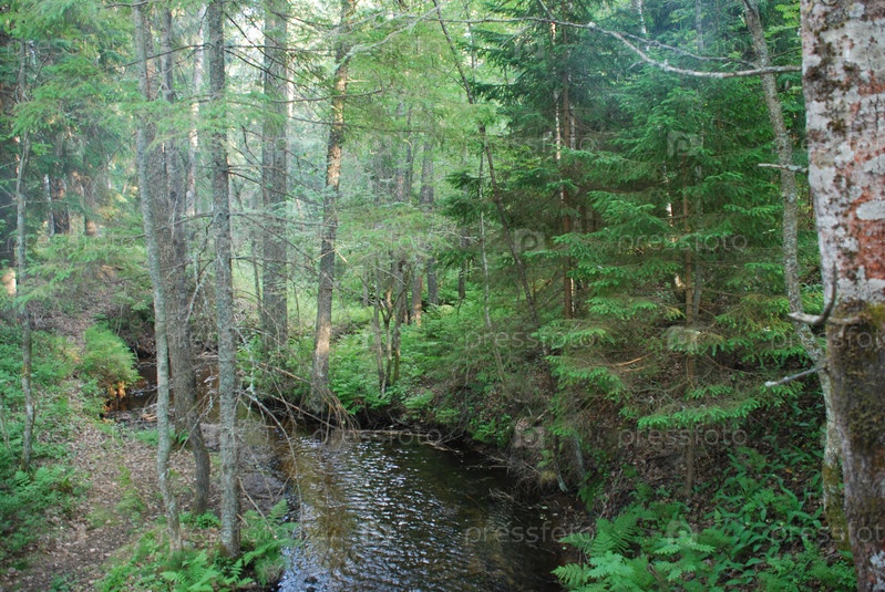 Быстрый ручей в хвойном лесу