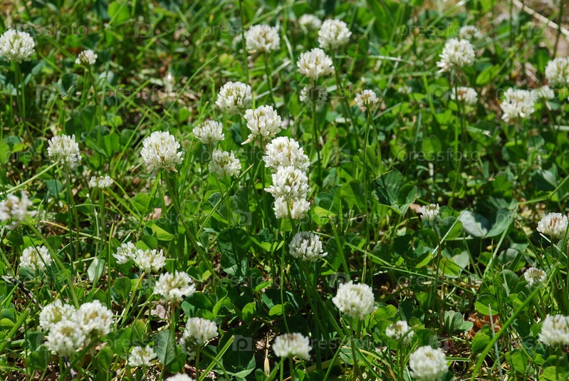 Цветы белого клевера среди низкой травы