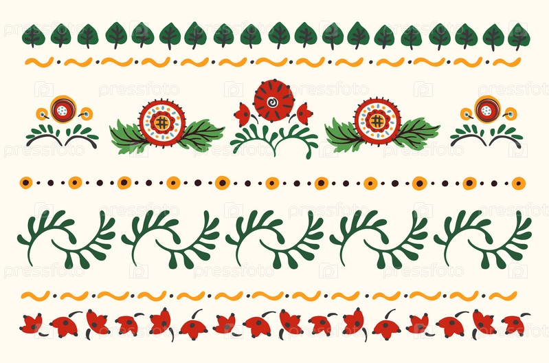 Набор этнических элементов. Бордюр представляет собой полосу с цветами, листьями, ветками, вензелями. Народная вышивка. Славянский, украинский, русский мотив. Хохлома, матрешка, дымковская игрушка. Мексиканский, индийский, цыганский ковер. Вязаное кружево