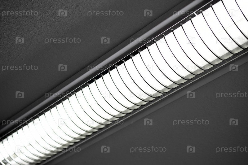 Люминесцентные лампы на побеленном потолке офисного помещения. Свет лампы на потолке