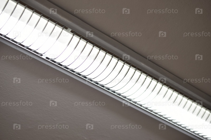 Люминесцентные лампы на побеленном потолке офисного помещения. Свет лампы на потолке