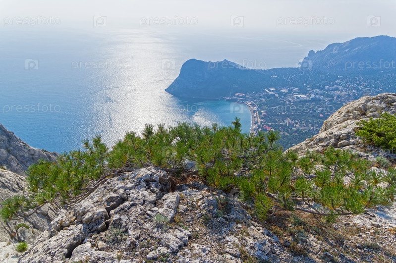 Маленькая реликтовая сосна с необычной (плоской) кроной. У вершины горы Сокол, Крым. Солнечный день в октябре