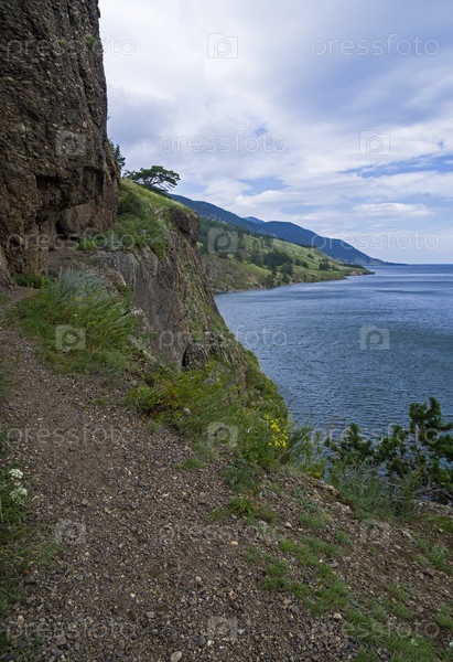 Опасное место на Большой Байкальской Тропе, известное как "Чертов Мост". Тропа проходит по крутому обрывистому скальному склону. Прибайкальский национальный парк, Иркутская область. Август