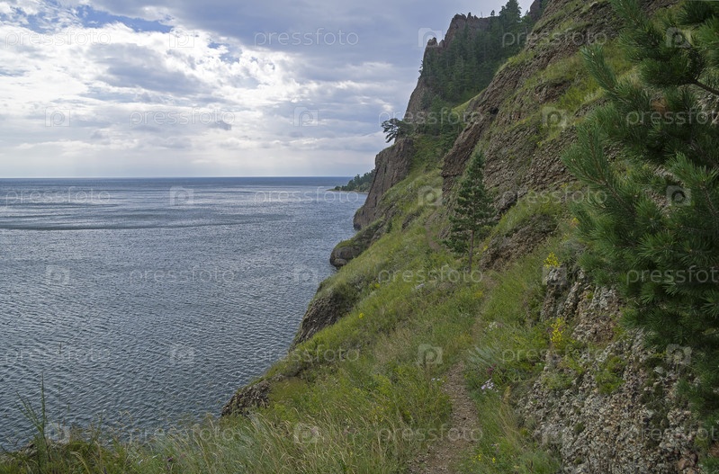 Опасное место на Большой Байкальской Тропе, известное как "Чертов Мост". Тропа проходит по крутому обрывистому скальному склону. Прибайкальский национальный парк, Иркутская область. Август