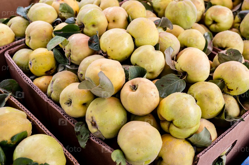 Свежая органическая айва на фермерском рынке. Осенний урожай яблочной айвы. Здоровая веганская еда