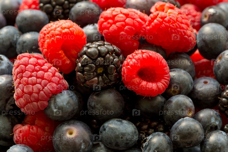 Куча малины, черники и ежевики. Свежая ягода на фермерском рынке. Концепция летнего урожая