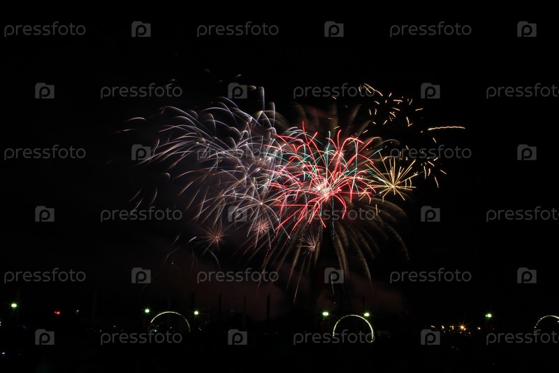 Разноцветный фейерверк в темном небе, празднование дня города