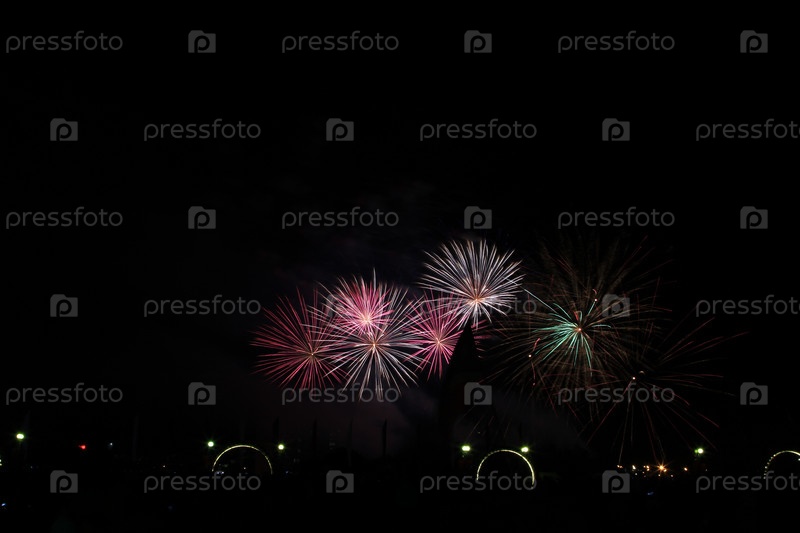 Разноцветный фейерверк в темном небе, празднование дня города
