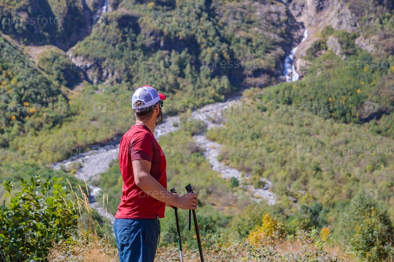 Путешественник с тростями смотрит вдаль по тропинке в горах к водопадам