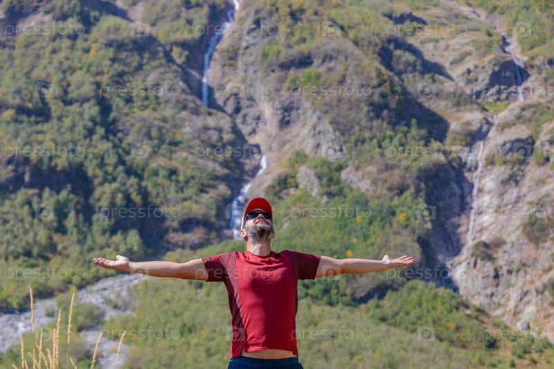 Турист-мужчина радуется поездке в горы, широко раскинув руки