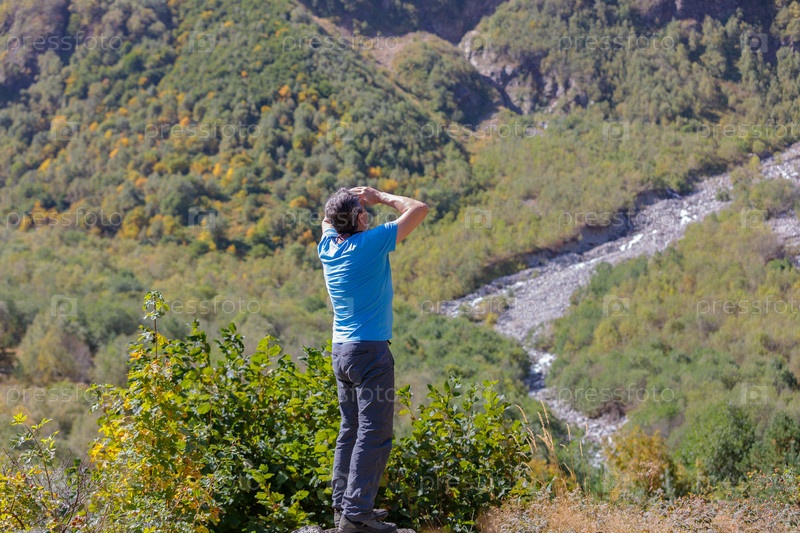 Турист путешествует по горам, стоит на камне и смотрит вдаль