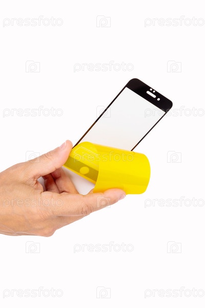 Рука держит защитный экран для мобильного телефона. Белый фон. Крупный план