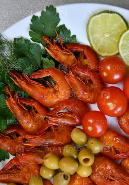 Вареные креветки со свежей зеленью