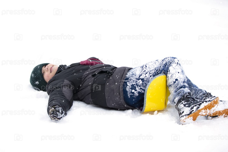 Ребенок зимой. Мальчик упал на санки и лежит в снегу