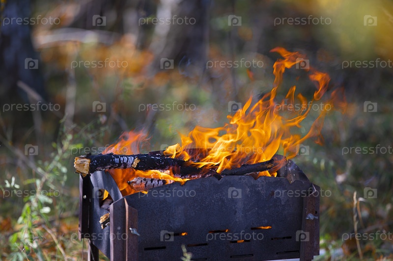 Огонь горит в жаровне на фоне леса