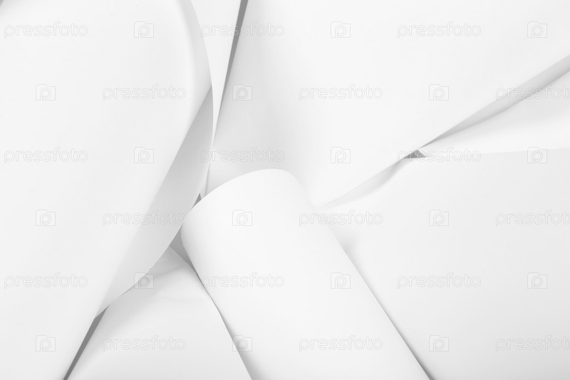 Белые листы офисной бумаги скручены и разбросаны. Бумажный белый абстрактный фон