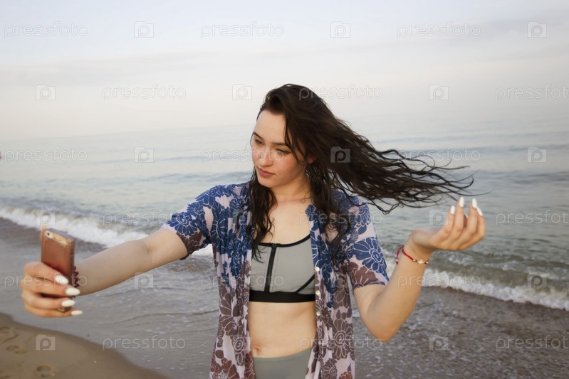 Красивая девушка делает селфи на берегу моря