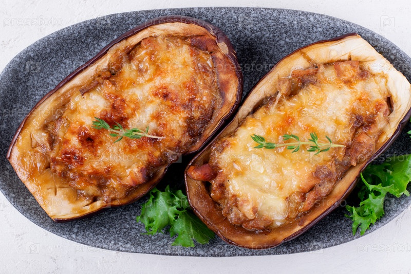 Половинки баклажанов, фаршированные обжаренными овощами, шампиньонами и сыром. Горячее вегетарианское блюдо. Вид сверху