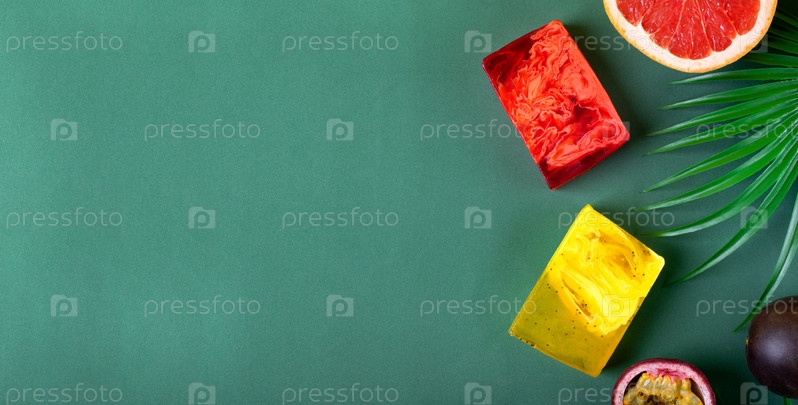 Веб-баннер с кусками мыла красного и желтого цветов с маракуйей и грейпфрутом на зеленом фоне. Вариант продукта по уходу за телом ручной работы с натуральными ингредиентами. Макет с копией пространства