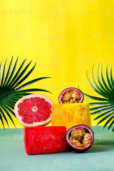 Куски мыла красного и желтого цветов с маракуйей и грейпфрутом. Вариант продукта по уходу за телом ручной работы с натуральными ингредиентами