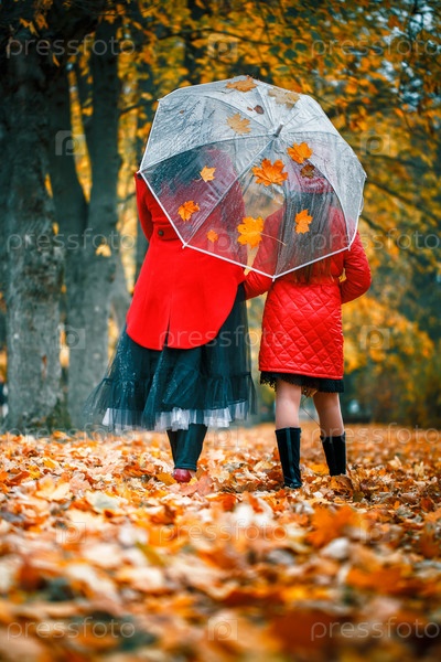 Семья гуляет в осеннем парке под прозрачным зонтиком