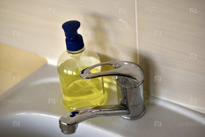 Блестящий кран с водой и умывальник с жидким мылом в номере. Место для умывания и мыла