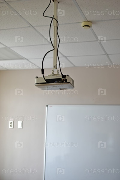 Белый проектор в маленьком зале школы напротив доски. Офис с проектором. С потолка свисает проектор