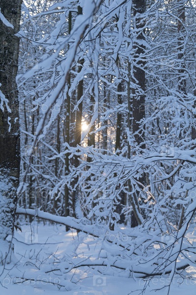 Зимний пейзаж - солнце светит сквозь заснеженные ветки деревьев. Солнечный день в январе. Битцевский лесопарк, Москва