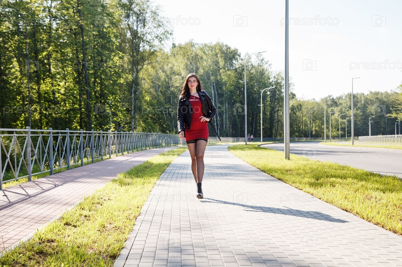Молодая брюнетка в красном платье гуляет по аллее в парке в солнечный летний день