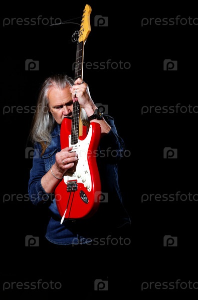 Пожилой мужчина с длинными седыми волосами в синей джинсовой рубашке играет на электрогитаре на черном фоне