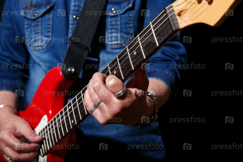 Пожилой мужчина в синей джинсовой рубашке играет на электрогитаре на черном фоне. руки крупным планом