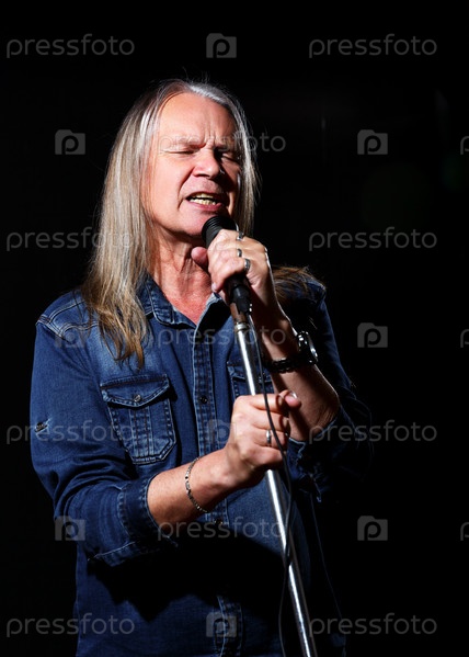 Пожилой мужчина с длинными седыми волосами в синей джинсовой рубашке поет в микрофон на сцене на черном фоне