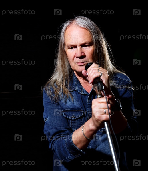 Пожилой мужчина с длинными седыми волосами в синей джинсовой рубашке поет в микрофон на сцене на черном фоне