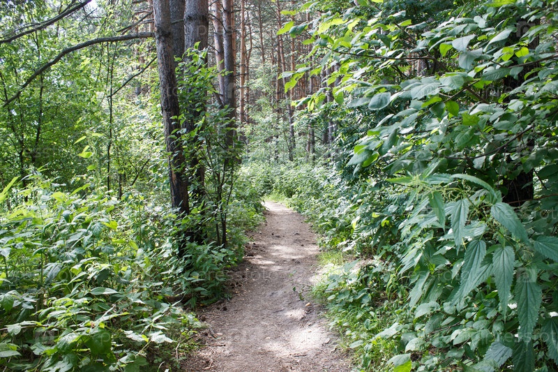 Грунтовая тропа в лесу в сибири в солнечный летний день