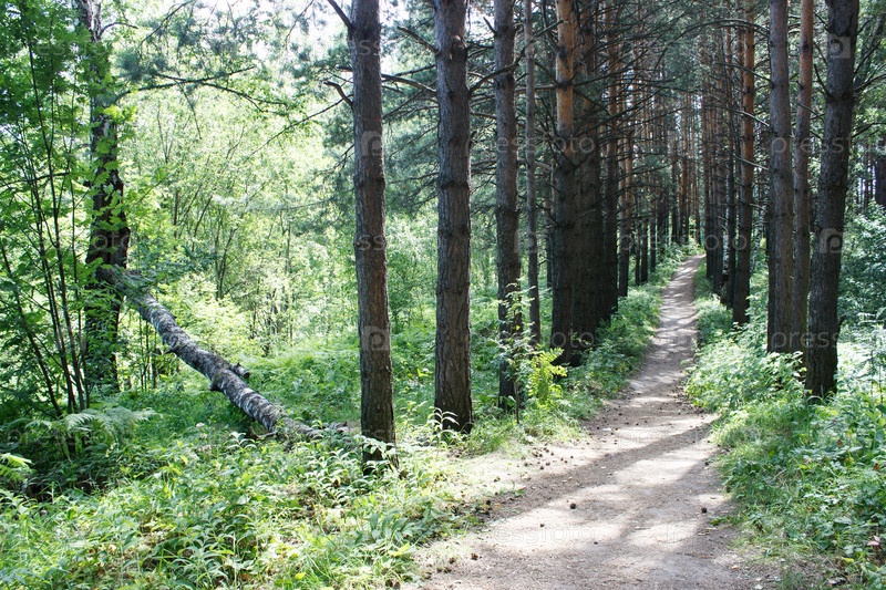 Грунтовая тропа в лесу в сибири в солнечный летний день