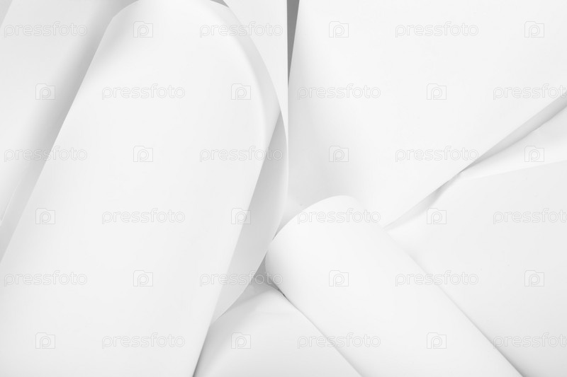 Белые листы офисной бумаги скручены и разбросаны. Бумажный белый абстрактный фон