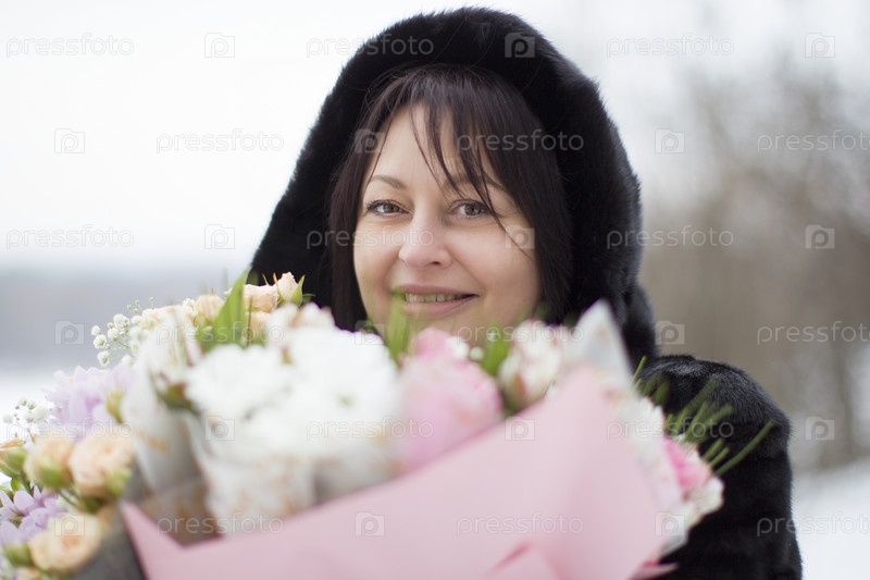Женщина средних лет с букетом цветов зимой