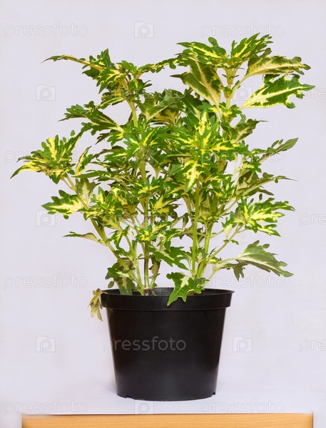 Красивое ярко-зеленое комнатное растение в черном цветочном горшке на столе