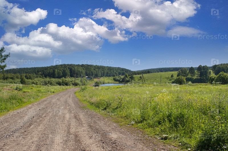 Грунтовая дорога в сибирской деревне в солнечный летний день