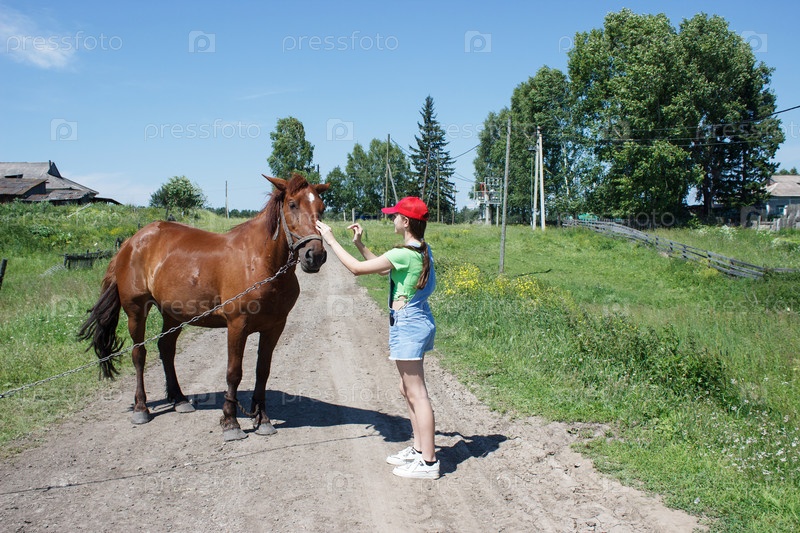 Красивая брюнетка играет с лошадью в сибирской деревне летом