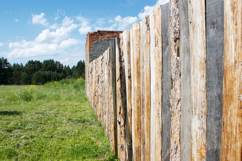 Сельский пейзаж с деревянным забором на лугу в сибирской деревне в летний день