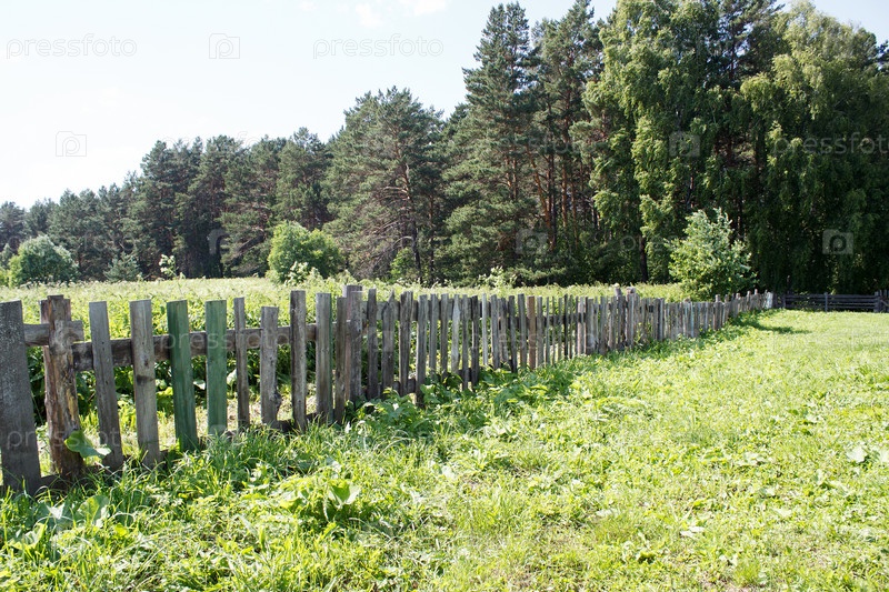 Сельский пейзаж с деревянным забором на лугу в сибирской деревне в летний день