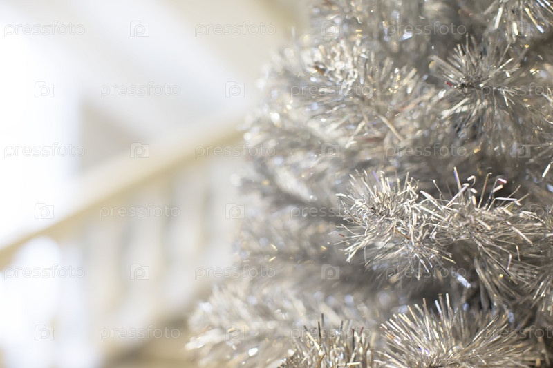 Часть елки из серебряной мишуры. Белая рождественская елка с серебряным украшением крупным планом