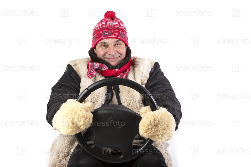 Забавный взрослый мужчина держит руль автомобиля на белом фоне
