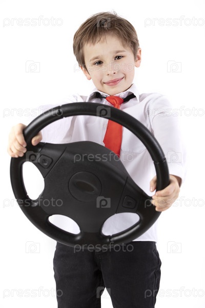 Забавный маленький мальчик держит руль автомобиля. Молодой водитель на белом фоне