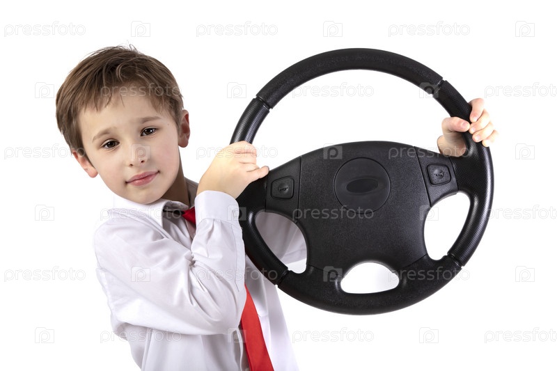 Забавный маленький мальчик держит руль автомобиля. Молодой водитель на белом фоне