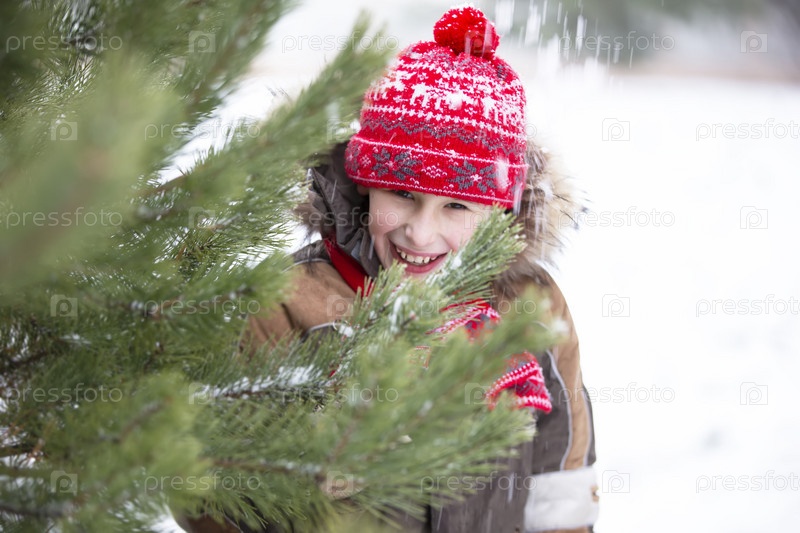 Забавный мальчик среди заснеженных елок. Ребенок зимой