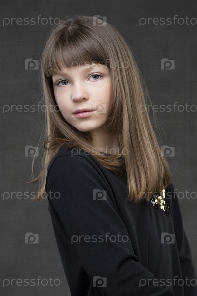 Красивая маленькая девочка смотрит в камеру на сером фоне. Ребенок европейского типа